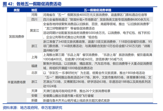 特征四:五一假期旅游持续升温,部分得益于政府加大旅游消费补贴、丰富消费场景。五一假期,各地文旅部门及各支持机构积极探索文旅融合新模式,举办超5万场特色活动,发放文旅消费券等补贴超4亿元。具体来看,四川通过“财政补贴+市场联动”发放各类文旅专项消费券6800余万元,省内A级景区(前3日)接待旅客、旅游收入较春节假期均有回升;天津打造海河夜间经济带,假期首日共接待游客282.5万人,同比25.9%、较春节假期提升9.2pct;浙江推出超2000场活动、340项文旅活动优惠政策,假期前2日共接待游客1774万人,同比9.8%,涨幅与春节假期相近。