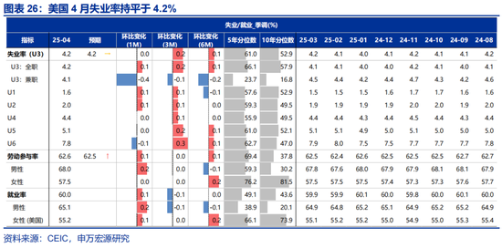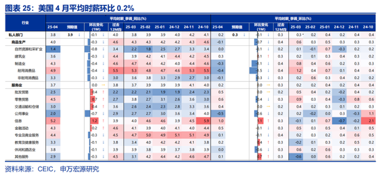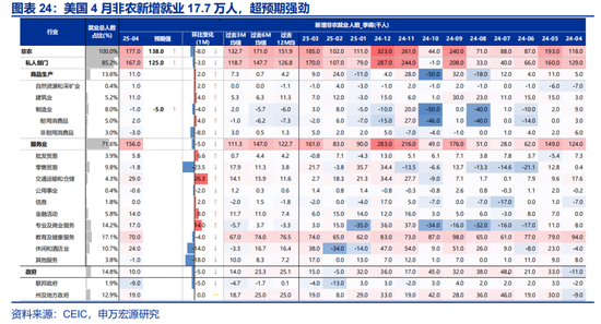 交运仓储业新增就业在4月大幅改善,未来关注关税对其冲击传导。从非农结构来看,商品生产行业就业表现不弱,新增1.1万人,强于3月,其中建筑业、耐用消费品制造业新增就业人数分别为1.1万人、2000人;服务业新增就业15.6万人,小幅弱于3月的16.1万人。其中,交通运输仓储就业新增2.9万人、专业商业服务新增1.7万人,均强于3月。但是,休闲酒店业、教育健康业新增就业人数2.4万人、7万人,均较3月放缓。