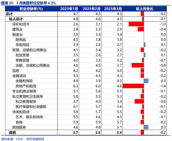 美国3月职位空缺率4.3%,前值4.5%,职位空缺人数719.2万人,市场预期750万人,弱于市场预期。从结构上来看,采矿伐木业、地产业、运输仓储公用事业空缺率大幅下降。