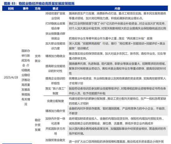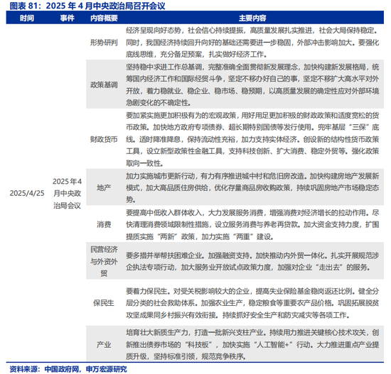 4月中央政治局罕见在下旬提前召开,讨论扩内需、促消费、稳定就业等方面政策。本次会议对外部风险保持高度警惕,首次采用“国际经贸斗争”表述,与“反腐败斗争”措辞一致。会议聚焦内部高质量发展,强调“坚定不移办好自己的事”,“着力稳就业、稳企业、稳市场、稳预期”。会议强调“根据形势变化及时推出增量储备政策,加强超常规逆周期调节”。