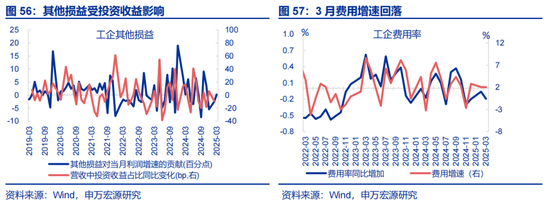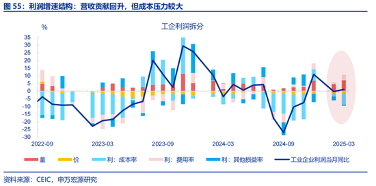 3月利润增速回升主要源于营收改善,其他损益、费用等短期指标也有贡献;而成本压力等中期约束有所增大。3月,工业利润当月同比回升2.8pct至2.5%。拆分结构看,利润回升主要源于营收改善,在PPI同比偏弱的背景下,实际营收当月同比较前月回升1.9个百分点至7.1%,支撑利润同比上行6.2%。利润率对工企利润的贡献主要体现在费用、其他损益(投资收益、营业税金及附加等杂项支出)等短期指标回升,其对利润增速的贡献分别较上月上行2.5、2.8pct至3.8%、0.3%。相比之下,成本对利润仍然构成较大约束,拖累整体利润同比下行5.9%。