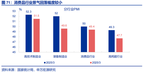 观察行业看,高技术、装备制造等行业PMI普遍回落的情况下,消费品行业PMI降幅较小,可能与内需表现较好有关。从重点行业看,4月高技术制造业、装备制造业、高耗能行业PMI回落幅度较大,分别较前月下行0.8、2.4、1.6pct至51.5%、49.6%、47.7%。相比之下,受外需影响较大的消费品行业PMI降幅却较小,边际仅下行0.6pct至49.4%,可能受内需支撑较大。