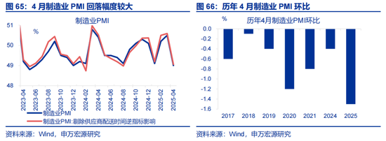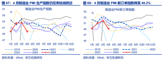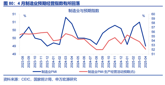 展望后续:关税加码,外需不确定性加大;但4月中央政治局会议强调“坚定不移办好自己的事”,后续需重点跟踪内需的边际变化。从4月PMI情况看,关税对新出口订单的影响已有显现,但前期订单“抢出口”加之内需支撑下,4月PMI整体下行幅度可控。往后看,关税对出口的冲击或加速显现,外需不确定性有所提升;而4月中央政治局会议强调“坚定不移办好自己的事”,“着力稳就业、稳企业、稳市场、稳预期”。伴随促消费、扩内需等政策加码,内需对制造业景气或形成较大支撑。