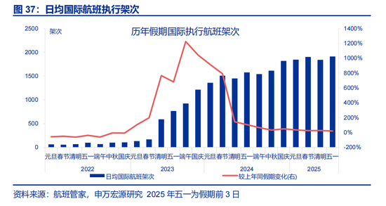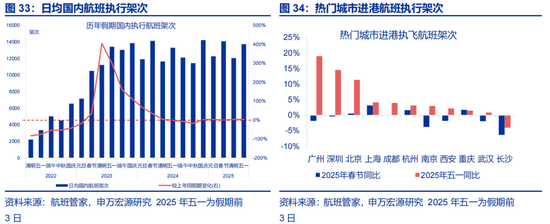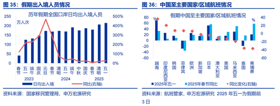 特征二:国内航班执行量明显回暖,跨境出行热度延续。五一前3日,国内执飞航班数较去年同期上行3.2%,同比较春节假期回升3.6pct。热门目的地航班数较春节假期也有明显回升,其中广州、深圳、北京等城市进港航班架次同比分别上行20.8、15、10.8pct。跨境出行方面,国家移民管理局预测,2025年五一假期全国口岸日均通关人数将达215万人次、同比27%。假期前3日,国际执行航班架次同比21.3%,反映跨境游热度较高。一方面,近期出台的境外旅客购物离境退税“即买即退”等政策助推下,入境游表现亮眼;携程数据显示,五一假期首日入境游订单同比增长141%。另外,出境游亦火热,中国至越南、印度尼西亚、韩国等航班数同比分别69.4%、26.7%、16.4%,较清明假期上行36.1、20.4、7.6pct;至日本航班数维持高位(同比52.3%)。