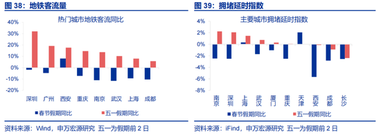 特征三:传统景点旅游热度回升的同时,县域旅游也迎来较快增长。五一假期,传统景点旅行热度回升,四川省A级景区(前3日)接待旅客、旅游收入同比20%、19.1%,涨幅较春节假期上行9.8、18.5pct;深圳、南京、上海等传统热门旅游城市地铁客流量(前2日)同比分别32.1%、13.7%、8%,较春节假期分别上行33.9、24.8、17.4pct。与此同时,县域、乡村旅游热度攀升,假期首日携程平台县域旅游订单同比增长近两成,乡村游订单增长超40%,以贵州荔波、辽宁本溪、广东清远、浙江安吉、河南洛阳、重庆武隆、湖北宜昌为代表的目的地景区平均核销增幅同比50%。