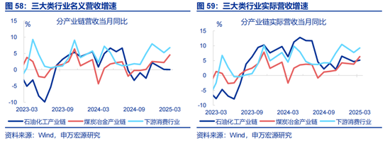 3月,营收增速回升较大的是煤炭冶金链与下游消费行业,主要受益于基建提速及以旧换新政策拉动。3月PPI同比回落0.3pct至-2.5%,但实际营收增速回升1.9个百分点至7.1%,支撑名义营收增速改善。分结构看,基建提速支撑冶金产业链实际营收改善幅度较大,当月同比较前月回升2.5pct至6.3%;以旧换新政策带动国内商品消费积极改善,也对消费制造业营收有拉动,行业实际营收增速同比边际上行1.5个百分点至9.2%。相比之下,石化产业链营收主要受价格拖累,而剔除价格因素的实际营收增速也有提升,当月同比较前月上行0.5pct至5.2%。