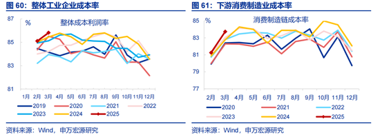 成本压力增大的仍为下游消费行业,反映刚性成本的拖累。3月,工业企业成本率(85.8%)处2020年来同期最高水平。拆分结构看,下游消费制造业成本率环比增加247.4bp至83.7%,上行幅度超过季节性(+181.9bp)。由于中下游产能利用率较低,刚性支出成本较大,中下游成本压力明显偏高。结构上,家具、食品、服装等成本率均有较大上行,环比分别+258.8、155.5、142.7bp。