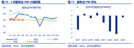 服务业方面,PMI回落幅度较小,更多是生产性服务业支撑。4月,服务业PMI边际仅下滑0.2pct至50.1%。结构上与生产性服务业相关的航空运输、电信广播电视及卫星传输服务、互联网软件及信息技术服务、保险等行业商务活动指数均位于55.0%以上较高景气区间;而水上运输、资本市场服务等行业PMI降至临界点以下。