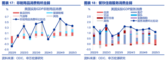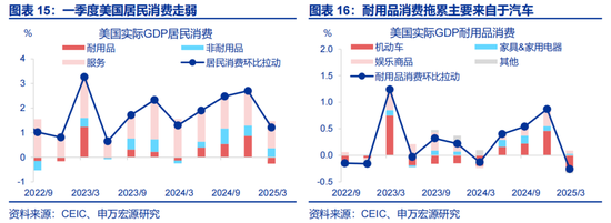 整体来看,2025年一季度耐用品、非耐用品、服务消费全线走弱,但3月消费超预期强劲。一季度美国实际居民消费整体走弱,耐用品、非耐用品、服务消费全线走弱。其中,耐用品消费拖累主要来自于汽车,服务消费拖累主要来自于餐饮住宿。但是,需关注到3月美国居民实际PCE消费较为强劲,环比0.7%,市场预期0.5%,或显示居民提前消费,一季度消费数据走弱主要反映的或是1-2月超季节性寒冷天气影响。
