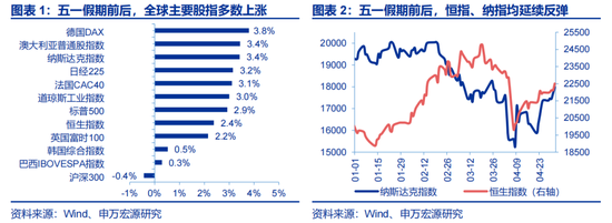 五一假期前后(4月28日-5月2日),海外主要股指集体上涨。美股方面,三大股指延续反弹,标普500、纳指和道琼斯工业指数分别上涨2.9%、3.4%和3.0%。亚洲市场,恒生指数上涨2.4%,日经225、韩国综合指数分别上涨3.2%、0.5%。欧洲方面,英国富时100指数、德国DAX、法国CAC40分别上涨2.2%、3.8%、3.1%。