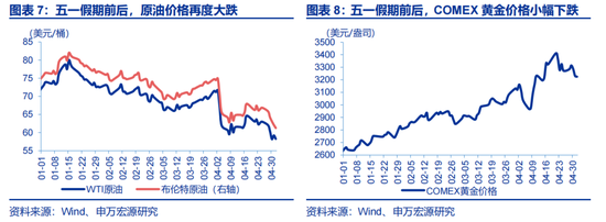 五一假期前后(4月28日-5月2日),油价大幅走弱、金价大幅回调。原油方面,OPEC+成员国同意将6月份的石油供应增加41.1万桶/日,加快了恢复产量的步伐,供给冲击下,油价大幅下跌,WTI原油、Brent原油分别下跌7.5%、8.3%至58.3美元/桶、61.3美元/桶。而随着衰退担忧有所缓和,黄金价格小幅回落,COMEX金本周下跌1.4%至3225.0美元/盎司。