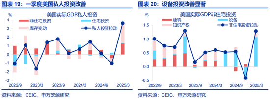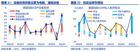 设备投资主要为电脑、通信设备改善,库存增加主要来自批发业。从私人投资领域来看,一季度美国住宅投资消费走弱、设备投资、库存投资大幅改善。住宅投资主要滞后受前期美债利率/抵押贷款利率高位冲击,设备投资结构上看主要为电脑、通信设备投资改善,而库存主要为批发业补库,凸显“抢进口”。