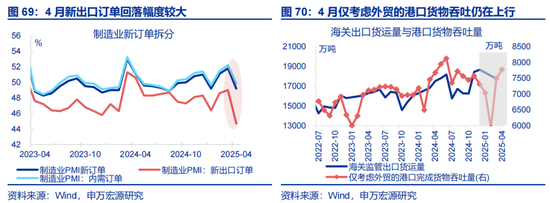 需求内部呈现分化特征,其中新出口订单指数降幅较大,但内需订单更具韧性。生产景气相对较高的情况下,4月外贸货运量同比+0.7pct至1.3%,主因前期订单在“抢出口”;但4月新出口订单指数大幅回落4.3pct至44.7%,或意味着后续出口有较大压力。此外,内需订单指数本月下滑2.3pct,但仍在荣枯线附近(49.9%)。