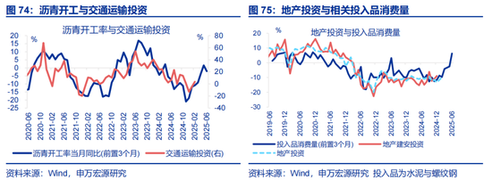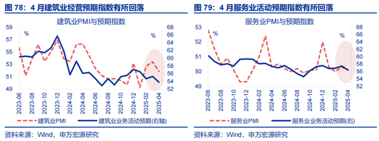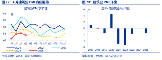 建筑业PMI回落主因地产走弱,但基建施工明显加快。4月,建筑业PMI回落1.5pct至51.9%。结构上,地产施工进度可能较慢;高频指标可以佐证,水泥与螺纹钢消费量与地产投资更相关,水泥出货率、螺纹钢表观消费量表现较弱。相比之下,土木工程建筑业商务活动指数较上月回升6.4pct至60.9%,表明各地工程项目建设有序推进,土木工程建筑施工进度有所加快。高频指标中沥青开工率与基建投资更相关,且领先投资3个月左右;去年10月以来,沥青开工率同比大幅回升。
