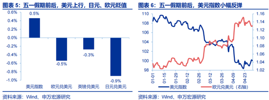 五一假期前后(4月28日-5月2日),美元指数小幅上行0.5%,欧元、英镑、日元兑美元均有所贬值,跌幅分别为0.5%、0.3%、0.9%。5月1日,美国4月ISM制造业PMI录得48.7,虽创五个月以来最大萎缩、但高于市场预期的47.9;数据公布后,美元指数快速走强,一度走强至100.4、收复100关口。随后美元指数小幅回落,但在周五非农数据的提振下,仍收在100.0,全周累积上涨0.5%。