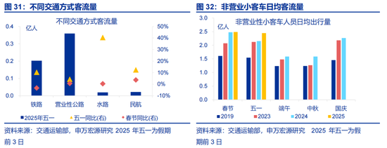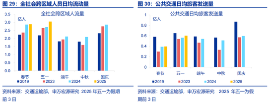 要闻:2025年五一假期前3日,全社会累计跨区域人员流动量9.2亿人次,日均人流量同比5.7%,较春节假期上行5.2pct。