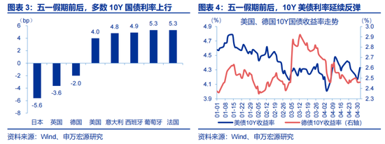 五一假期前后(4月28日-5月2日),主要发达国家的长期国债收益率多数回升。受非农数据超预期等消息影响,10Y美债收益率上行4.0bp至4.33%。其他债市方面,10Y德债下行2bp至2.46%,10Y法国、葡萄牙、西班牙、意大利国债利率分别上行5.3bp、5.3bp、4.9bp、4.8bp,10Y英国、日本国债收益率分别下行3.6bp、5.6bp。