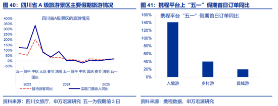 结构上,五一假期跨境游、县域游热度攀升。1)国内执行航班同比较春节上行3.6pct至3.2%,跨境出行热度延续,同比21.3%。2)传统景点热度回升同时,县域旅游也有较快增长,假期首日携程平台县域旅游订单同比增长近两成。3)假期旅游持续升温,部分得益于政府加大旅游消费补贴、丰富消费场景。4)电影消费表现平淡,票房同比-43.7%。