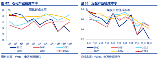 石化、冶金链成本率改善也不及季节性,整体在历史同期相对高位。3月,冶金链、石化链成本率虽然回落,环比分别-34bp至87.2%、-12.9bp至86.1%;但2019年来其3月平均降幅分别是72.7、83.2bp,冶金链、石化链改善幅度均不及季节性。具体行业中,金属制品、橡胶塑料、石油加工、通用设备成本率并未改善,分别较前月上行106.9、54、36.9、31.9bp至89.2%、85.5%、86.4%、82.2%。