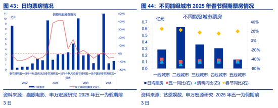 特征五:相比旅游消费,电影市场表现较为平淡。电影供给质量会影响观影需求,春节档在《哪吒2》、《唐探1900》等高质量影片的带动下,电影票房同比高达18.2%。而五一假期电影市场表现较为平淡,假期前3日,全国电影院线票房同比-43.7%。不同能级城市票房表现均较一般,其中一线、二线等较高能级城市票房同比分别-40.4%、-45.6%,较春节假期回落66、68.7个百分点。